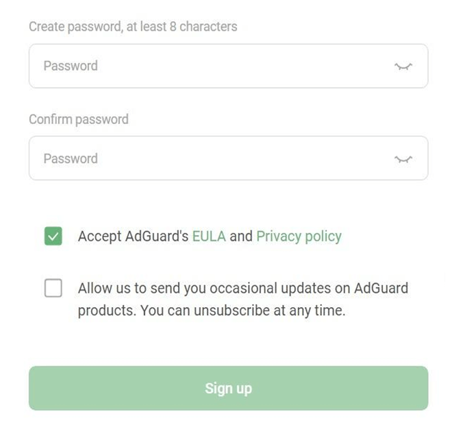 Нажав Continue with email, будет предложено создать пароль и повторно ввести его. Сделайте это и отметьте галочкой верхний пункт на согласие с правилами сервиса. Нажмите Sign Up. Поздравляем, вы зарегистрировались в AdGuard VPN.
